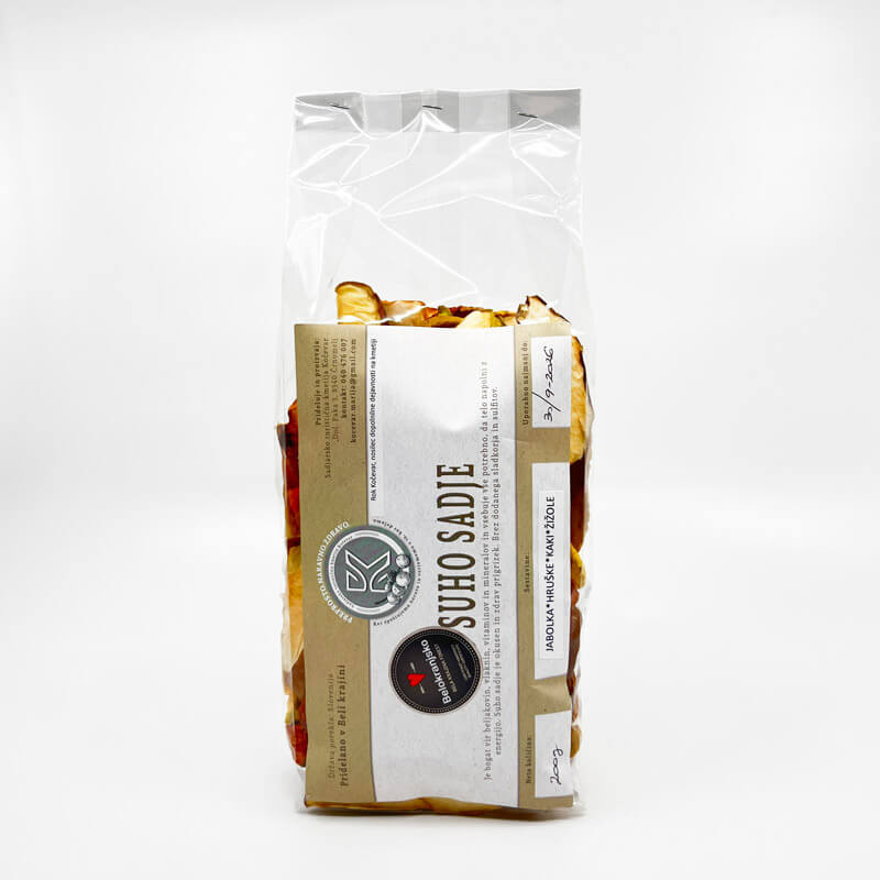 - Suho mešano sadje združuje hruške, jabolka, kaki in žižule v uravnoteženo kombinacijo okusov, ki ponuja raznolik in naraven prigrizek iz Bele krajine.
